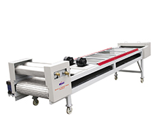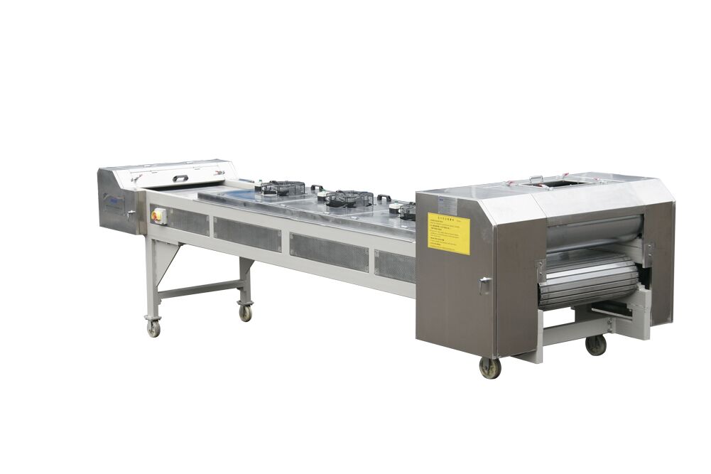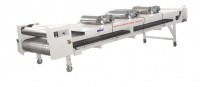 不銹鋼帶冷卻壓片機由壓輥、不銹鋼鏈板、破碎輥和行走機構組成。擠出機擠出的熱熔狀態物料經壓輥壓成1-1.5mm厚的帶狀物。壓輥采用水冷卻。物料在輸送過程中用吹風機吹風,繼續將物料冷卻成固態,破碎成片狀物料落入料斗。
